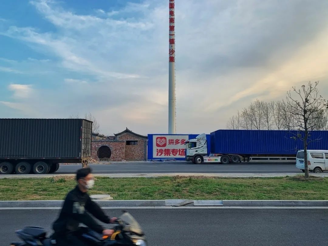 ▲徐牧左侧的信号塔上,写着“中国电商第一镇·沙集”。十几年前的沙集,供电不足、网络信号差,正是这座高50米的信号塔,保障了方圆十里的信息通讯。这是城里人口中的“新基建”,也保障了徐牧这些小镇青年的饭碗。