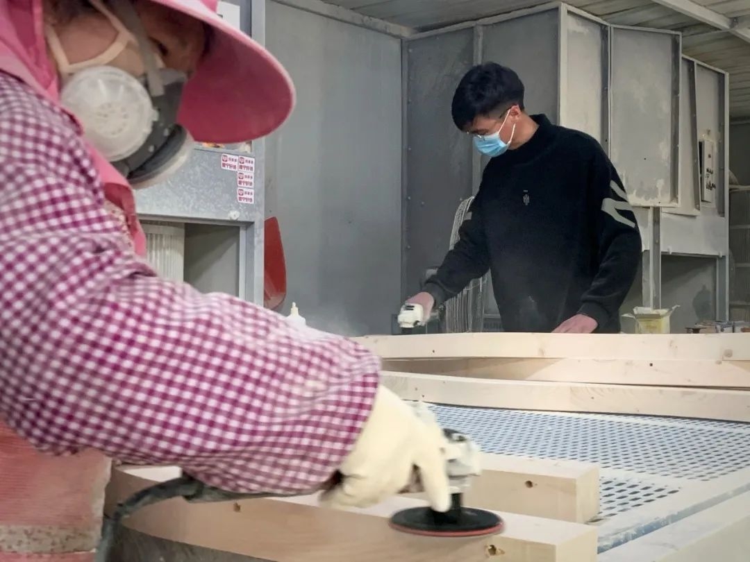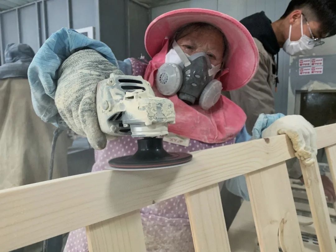 ▲偶尔,徐牧也会拿起打磨机,跟工人一起给木头打磨、抛光。