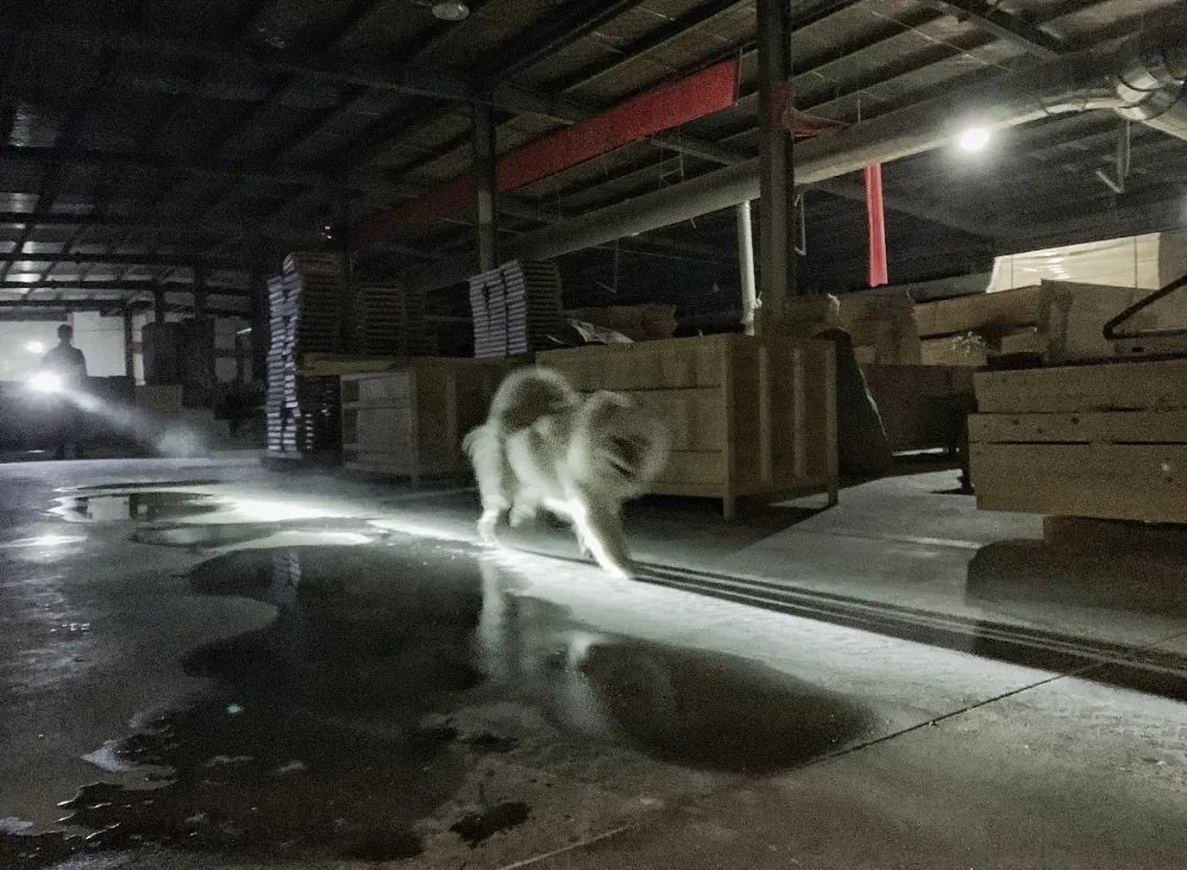 ▲工厂5点半下班。徐牧“押”完货后,还会拿着手电筒去工厂检查,看看门窗是否关好、电闸是否关闭。1小时前这里刚经过清扫消毒,地上还留有大片水渍。为了工人的身体健康着想,这是每晚下班前最后一个动作。空荡的厂房,只剩“三蛋”在黑夜中狂奔。