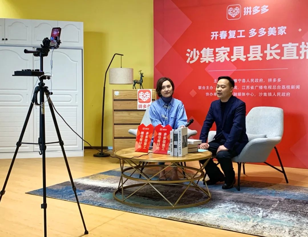 ▲3月29日下午,睢宁县长薛永来到了沙集的家具直播间。县长的到来,也吸引了260万消费者的关注。在镜头前,薛永县长向消费者介绍了徐牧和其他几家当地电商企业的产品。县长来直播当天,拼多多沙集家具就卖出了近千万元。