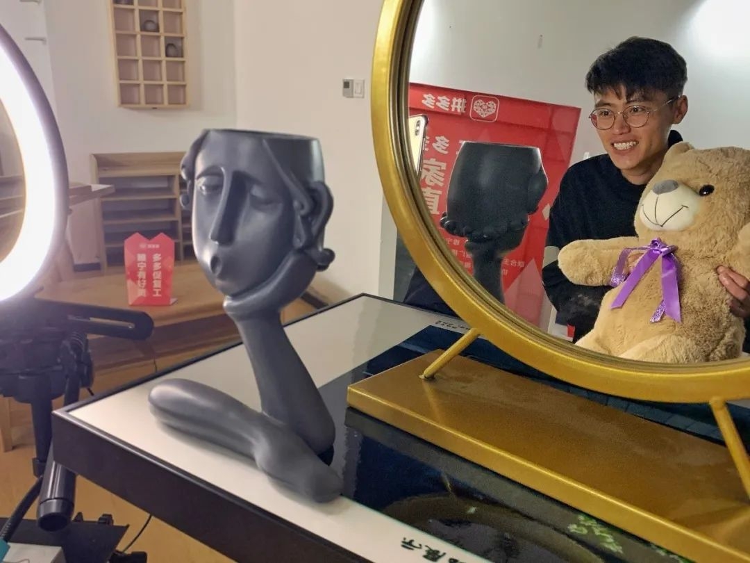▲一有时间,徐牧就会跑到里屋练习。为了观察自己的面部表情、肢体动作是否协调,他会在补光灯后面放一面大镜子。春节尝到直播甜头后,他四处寻找能带货的主播,现在公司已经来了两个,每天轮流在四五个店铺直播。人手不够,换他顶上。