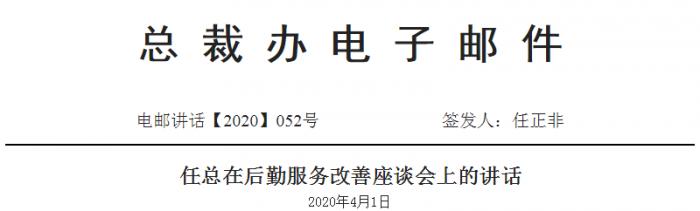 据华为心声社区,4月14日,华为对外公开了2020年4月1日任正非在后勤服务改善座谈会上的讲话,任正非在讲话中说,“奋斗的目的是什么?过幸福生活,公司一直倡导在思想上艰苦奋斗,没有说过要在生活上艰苦。”