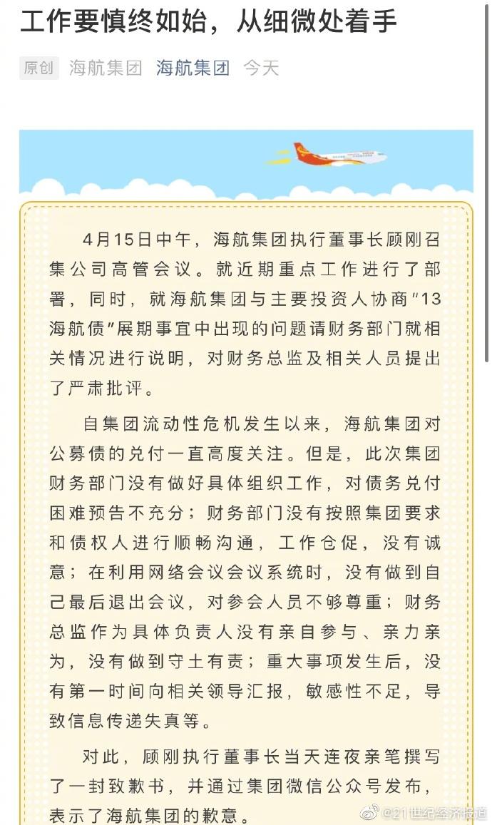 据海航集团微信公众号消息,4月15日中午,海航集团执行董事长顾刚召集公司高管会议。就近期重点工作进行了部署,同时,就海航集团与主要投资人协商“13海航债”展期事宜中出现的问题请财务部门就相关情况进行说明,对财务总监及相关人员提出了严肃批评。