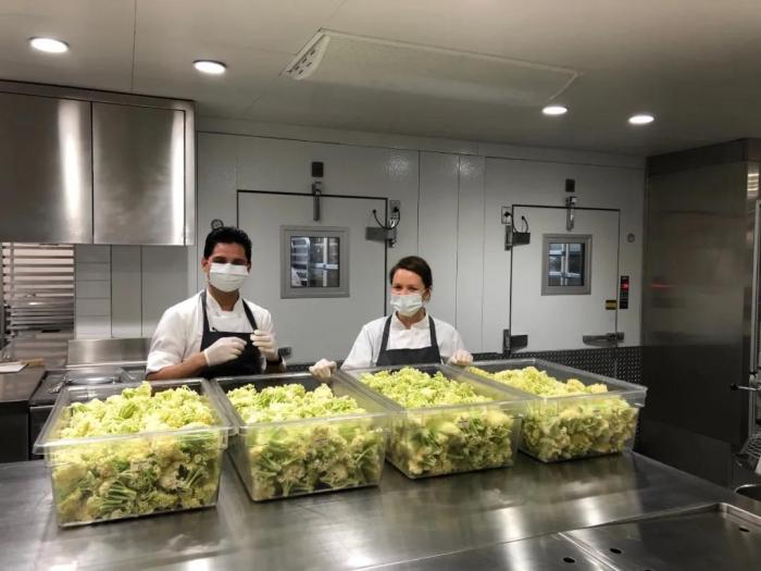 为了保证厨房的卫生和人员的安全,哈姆拆分了工作内容,把20位参与该行动的人员划成几个小组,以实现安全距离范围的同步工作。每个进入厨房的人都必须探测体温、洗手再带上手套。