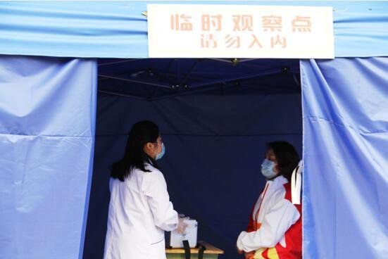 在当天的演练中,一名“学生”经过校门口红外线体温测试仪时显示体温异常。值班人员立即要求两条通道的人员停止体温检测,机动人员保持一米以上距离,带着体温异常的“学生”从检测通道的前方步行至隔离区。随后,校医复查学生时询问其旅居史、接触史、健康史。半个小时后,校医再次用水银温度计对其进行体温检测,无异常旅居、接触和健康史且体温正常后,才放行入校。每有“学生”隔离观察后离开,校方立即喷洒消毒该隔离区。