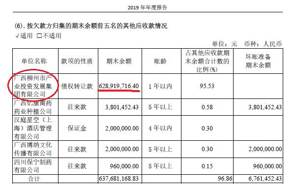 值得注意的是,两面针的其他应收款暴增至6.46亿元,而2018年末这一数据仅为0.84亿元,增加了5.62亿元。其中,其他应收款的欠款方第一名是广西柳州市产业投资发展集团有限公司,款项性质为“债权转让款”,约为6.29亿元。