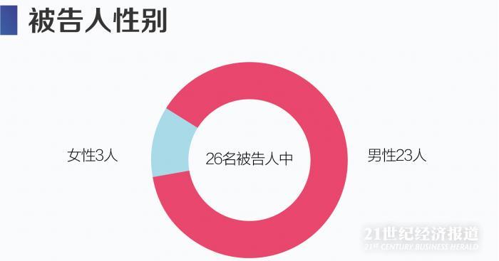 26名被告人中,男性23人,女性3人。男性互联网员工的腐败风险远远高于女性员工。