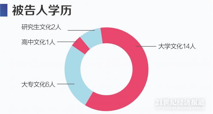 从学历来看,被告人普遍呈现高学历特点。其中,研究生文化2人,大学文化14人,大专文化6人,高中文化1人(另有3人未披露学历情况)。