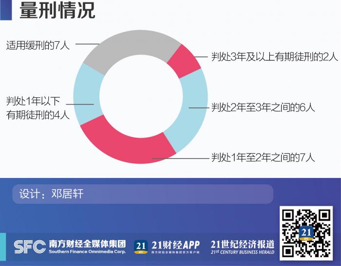 从量刑来看,判处3年及以上有期徒刑的2人,判处2年至3年之间的6人,判处1年至2年之间的7人,判处1年以下有期徒刑的4人,适用缓刑的7人。其中,判刑最重的为5年,缓刑适用率为26.9%。