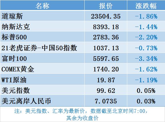 1、美联储经济褐皮书显示,美国经济正面临急剧收缩;欧美股市全线收跌,英、法、德股市均跌超3%,道指跌近450点;美油跌破20美元关口,创逾18年来收盘新低。21老虎证券-中国50指数报1037.13点,跌0.73%。50只成分股中,14只上涨,安踏体育、小米集团、神州国际等涨幅居前。
