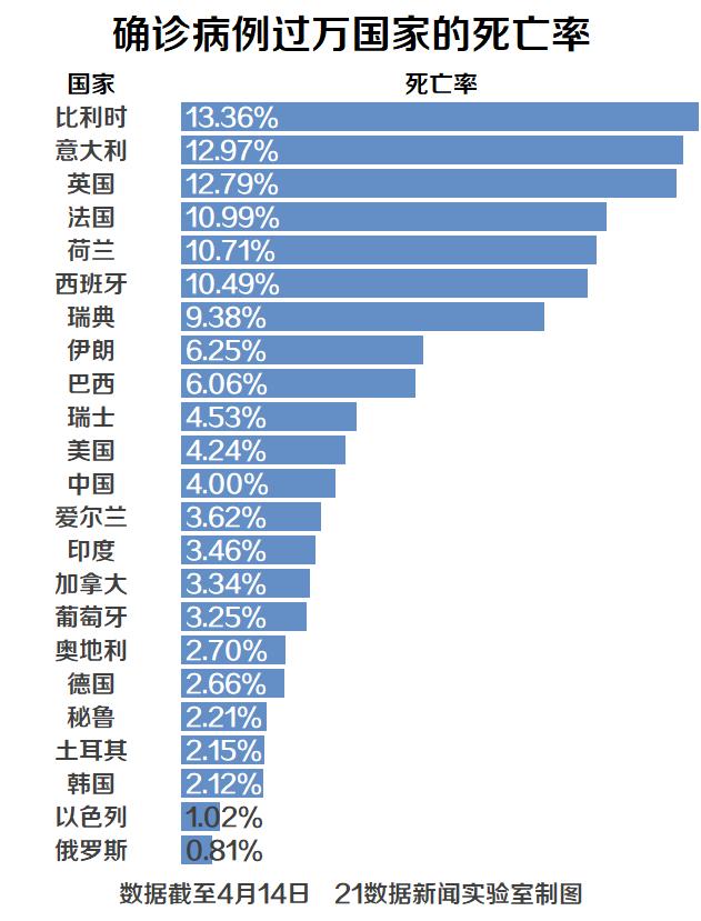 从确诊病例过万的国家的死亡率来看,有6个国家死亡率超过10%,其中比利时死亡率最高,达到13.36%。