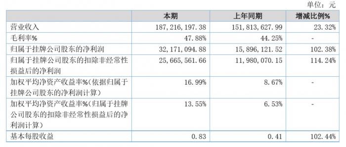 报告显示,去年公司实现营业收入1.87亿元,较上年同期增长23.32%;实现净利3217.11万元,同比增长102.38%,公司毛利率提升了3.63个百分点至47.88%。