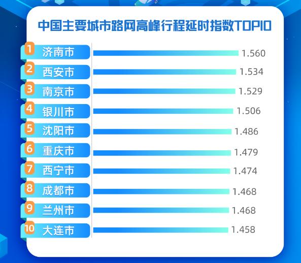 在全国主要经济区域中,长三角、珠三角和京津冀等区域的高峰拥堵延时指数均低于全国平均值,其中长三角区域和珠三角区域高峰拥堵延时指数均为1.33,低于全国1.39,是交通状况最好的区域。成渝地区高峰拥堵延时指数是1.43,全国最高。