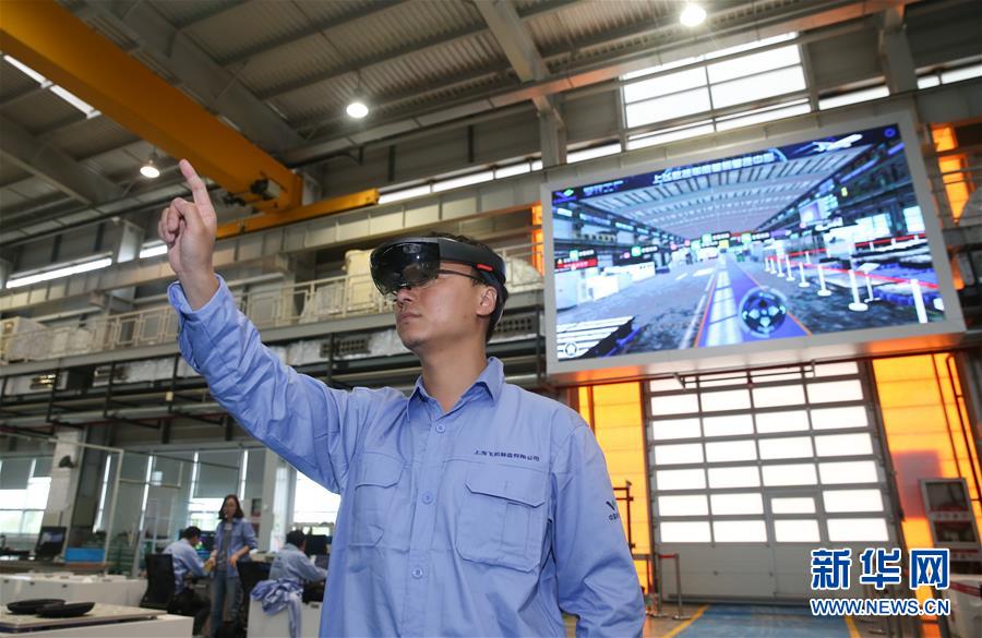 工作人员在中国商飞公司总装制造中心智慧数控车间使用AR眼镜操控虚拟电子屏幕(2018年5月5日摄)。新华社记者丁汀摄