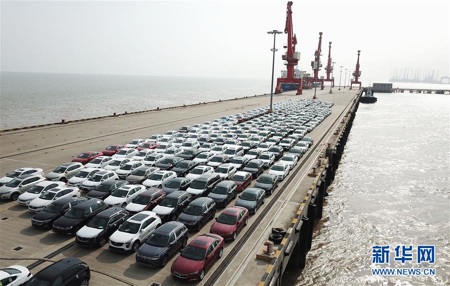 在位于上海临港的上海南港码头,新出厂的汽车等待装船转运(2019年6月27日摄,无人机照片)。新华社记者方喆摄
