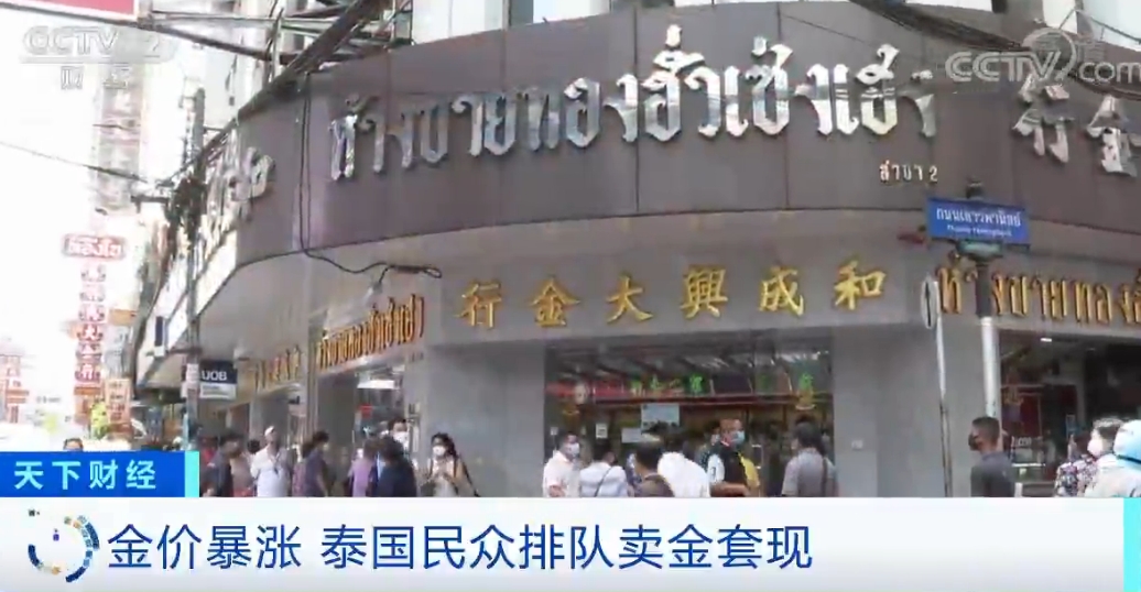 总台记者 骆魏:泰国曼谷的唐人街——耀华力路有很多金店,新冠肺炎疫情让曼谷的很多街道都非常冷清,但是由于金价上涨,这边的金店却异常火爆,很多民众一早就过来排队,他们想要趁着这一拨行情出售黄金套现。