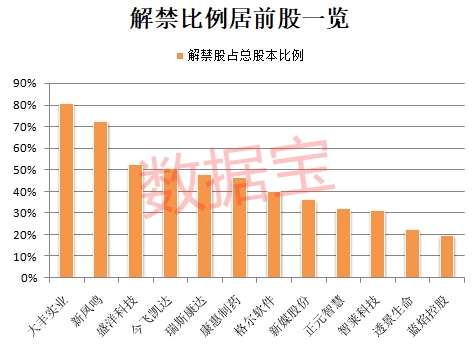 解禁比例最高的是大丰实业,下周该股有3.24亿股将上市流通,解禁股占总股本比例为80.65%,公司于2017年上市,迄今已快满三年。6股解禁股数量占总股本比例不足1%,包括海越能源、苏博特、江苏吴中、丰林集团、凯莱英、太龙药业等。