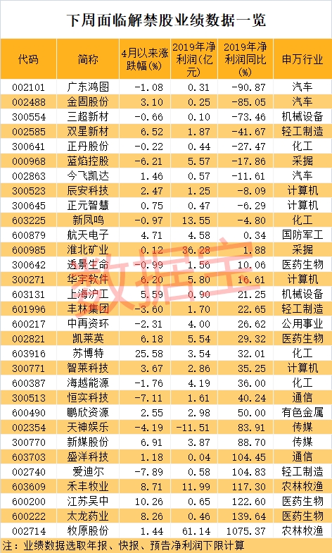 部分解禁股去年净利润将大幅增长,其中牧原股份净利润增幅最高,其次是太龙药业,公司去年实现盈利0.46亿元,同比扭亏为盈。江苏吴中去年净利润为0.65亿元,同比扭亏为盈。禾丰牧业、爱迪尔、盛洋科技等均有望同比翻倍增长。