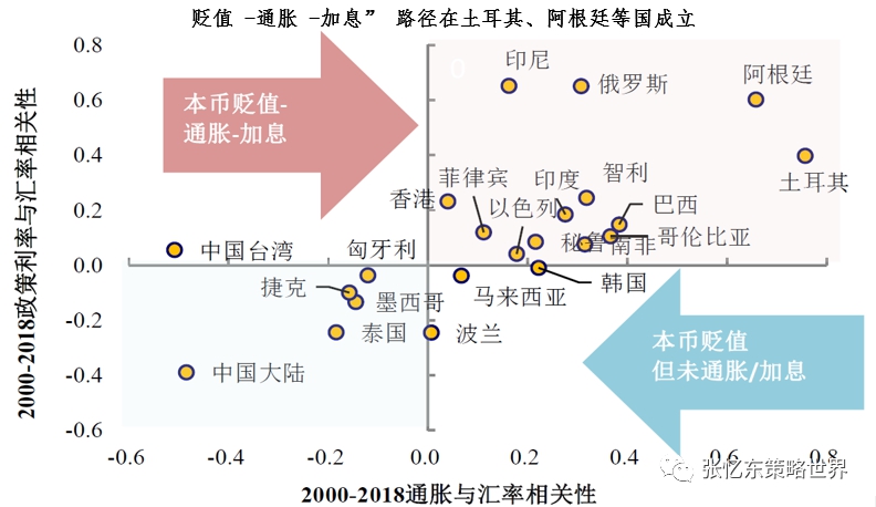 这个图横轴所反映的就是本币贬值和通胀的相关性,纵轴是利率和汇率的相关性。
