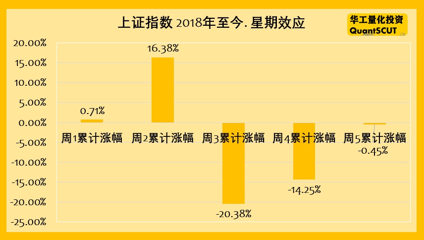 本周二我在朋友圈发过一个2018年上证指数周1~周5的“星期效应”收益统计图(下图)。统计结果显示,2018年以来上证指数仅仅在周2持股,累计收益可达16.38%,是一周中收益最高的。而周3和周4的收益是最差的两天。
