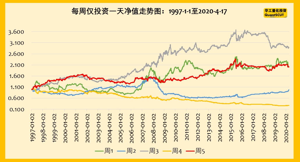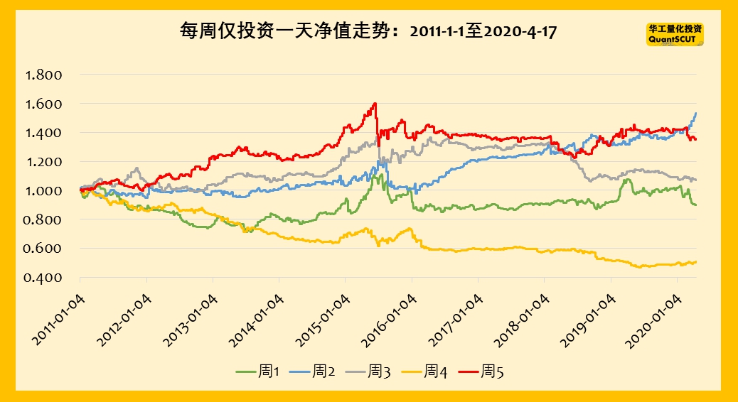 (2)周1和周5的收益几乎相同。从净值的走势图来看,周1和周5出现交替上升。但周5的收益比周1更为平稳。