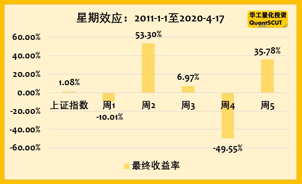 我们先分析近十年来上证指数的数据,来验证A股是否存在“星期效应”。分析方法:假设每周我们只在固定的1天持有上证指数,其余时间空仓,我们计算每周固定1天的收益。以周2为例,我们测试每周2持有上证指数,其余时间空仓。具体操作就是周1收盘的时候,按收盘价买入上证指数,周2收盘的时候,按收盘价卖出股票(指数)。那么选择周1到周5不同的1天持有上证指数,收益情况如何呢?我们统计分析了2011年1月1日至2020年4月17日的数据,结果如下。