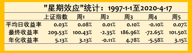 这个图引起了朋友们的兴趣。不少人表示跃跃欲试,拿来操刀A股市场。大家先别急,先看看我们今天的文章再说。A股星期几最赚钱,是否存在所谓的“星期效应”,是否真的可以用于投资呢?今天,我们拿上证指数更长的历史数据来回答上述问题。
