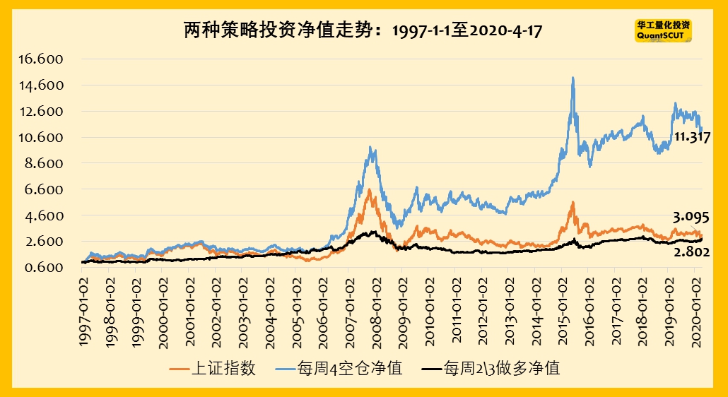 (4)周四的收益依旧是负数,是每周最差的一天。从1997年以来,周四累计亏损了72.65%。而且,从周4净值走势来看,也是亏的相当稳定。我们依旧测试每周4空仓和每周仅在周2和周3持股的策略结果。净值走势如下图。