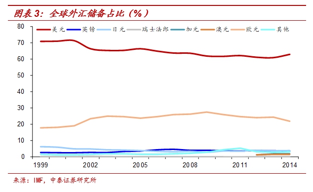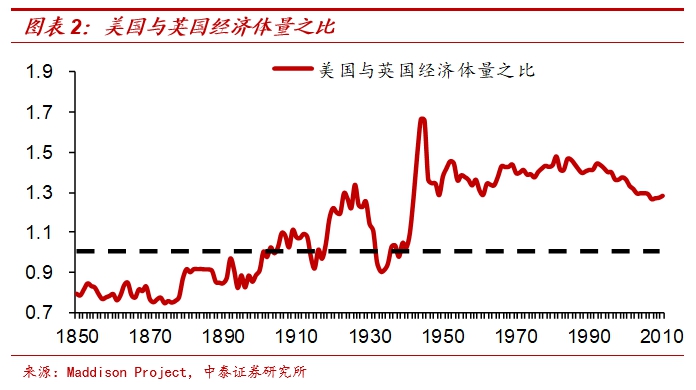 而纸币归根到底是“纸”,是人造的货币,其稀缺性主要靠发行者的“自觉”。纸币的背后是政府信用,是国家强制使用的法定货币。但其实纸币的印刷成本很低,不会比前面提到的“贝壳”高多少,供给多少纸币是人为决定的。所以纸币的稀缺程度并不是大自然控制的,而是人为控制的。所以在第一次世界大战期间,由于政府开支急剧增加,纸币大肆发行,贬值严重,兑换黄金越来越困难,欧洲主要国家逐渐放弃了金本位制度,美国也于大萧条时期放弃了金本位。各国纸币竞争性贬值,通胀高企,国际货币体系一片混乱。为了改变这一局面,1944年布雷顿森林体系建立,美元以35美元/盎司的价格盯住黄金,其他国家的纸币与美元挂钩,以保证各国纸币币值稳定。美元之所以在各国纸币中处于主导地位,归根到底是由美国的经济地位决定的。因为只有经济稳定和强大,才能确保政府不大量“印刷”纸币,才能保证币值的稳定。在一战之前,英国是全球最强大的经济体,英镑是国际货币体系的主导。而两次世界大战之后,美国经济远远超过了英国,成为最强大的经济体,而且当时美国拥有全球75%的黄金储备,为美元提供强大的支撑。