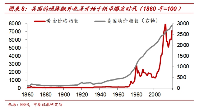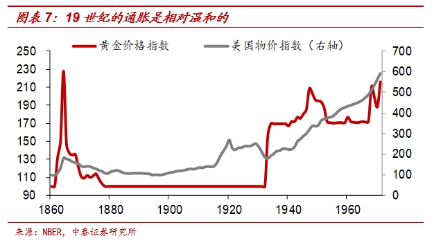 纸币的大量发行,相对稀缺性下降,往往也会导致纸币衡量的整体物价水平的上升,即通胀现象,钱不值钱。在1860年之后的40年时间里,美国物价水平只上涨了11%,年化通胀率不到0.3%,通胀速度是非常缓慢的。此期间的通胀上涨主要集中在了美国内战前后,当时黄金价格也大幅飙升,之后美国通胀和金价均大幅回落。