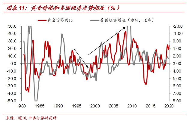 如果一家企业的价值是1个亿,央行发行1个亿的货币来购买这家企业,那么央行发行的这1个亿的纸币是有价值的,因为它背后对应了一家等值的企业。但如果央行发行2个亿,去购买这家价值1亿的企业,那么央行发行的这2个亿,其实只价值1个亿,货币就超发了,纸币就贬值了。黄金作为一种天然的货币,它的存在就是来对抗人造纸币的超发的。当经济增长好的时候,央行也会发行货币,但购买的资产质量也是可以的,即发行的纸币对应的是有价值的,纸币是保值的,黄金就没有什么大行情。例如上世纪90年代,美国经济稳健增长,黄金价格一直萎靡。最近一波黄金的十多年大行情终结于2012年,而美国经济也正是在2012年之后企稳回升的。但当经济不好的时候,纸币就要开始超发了,黄金的大行情就来了。如果你发现央行或银行在拿着纸币,去大量购买本来毫无市场价值的居民次级房贷、企业垃圾债券,或者去救助毫无效率的企业,或者直接给没有付出任何劳动的人发钱,或者直接发钱给政府花,而这些纸币和你辛苦劳动挣取的纸币是一样的,那你挣取的纸币还保值吗?显然不会,有价值的纸币受到了无价值的纸币的“腐蚀”。