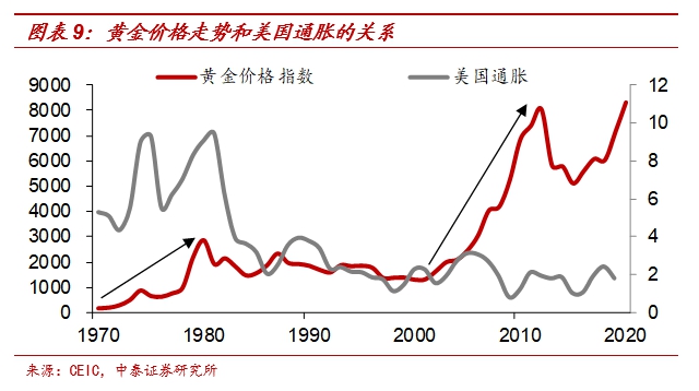 进入20世纪后,通胀上升速度开始加快。尤其是一战、二战期间,通胀水平都明显飙升。战争经济过后,凯恩斯主义政策开始盛行,其核心就是当经济衰退的时候,政府采取财政和货币政策来刺激经济。纸币的印刷速度开始加快,币值要盯住黄金也越来越困难,纸币衡量的通胀水平也开始加速上涨,从1900年到1971年间,美国年化通胀率从之前的不到0.3%上升到2.4%。而布雷顿森林体系崩溃后,才是历史上通胀上升速度最疯狂的时候。1971年至今,美国年化通胀率达到了3.4%。尤其是在70-80年代的滞胀时期,美国的物价水平上涨了1.3倍,黄金的价格上涨了10倍以上。