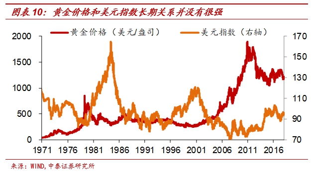 从黄金作为美元标价的大宗商品角度看,美元指数和黄金价格理论上应该有微弱的负相关性。这是因为美元指数走强时,其他货币相对走弱,美元标价的商品价格就会显得偏高,商品价格会有下行压力;反之,美元走弱时,大宗商品价格一般也会上行。但将时间拉长了看,发现金价和美元指数之间并没有什么相关性。例如在美国大稳健时代的十几年里,美元指数几次大起大落,而黄金价格却走势平平。再比如,2005-2012年间美元指数震荡走平,但黄金价格却上涨了3倍多。近期美元维持强势,但依然没有阻挡住黄金的大涨。