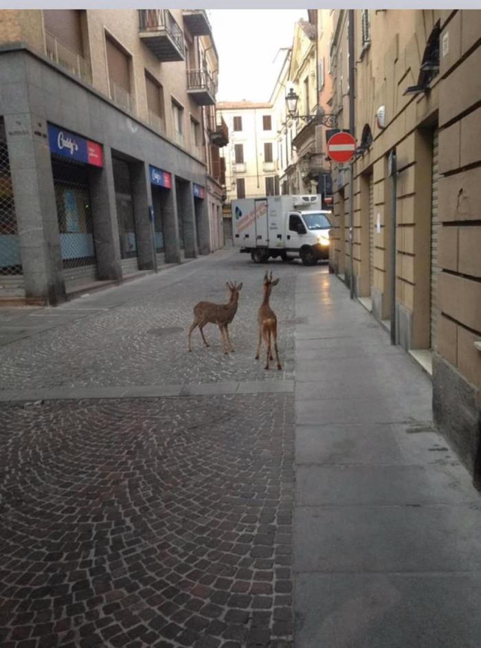 姐姐说:在距离我们20分钟的一个小城Casale Monferrato ,今天早上街头出现了两只野鹿,它们看起来弱小,站在空无一人的街头,不远处一辆货车正在拐弯。