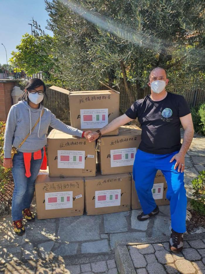 Olmo是当地一个慈善家,他家庭富有,常常进行捐助。此次疫情期间他捐钱捐物给当地医院以及需要的机构和人群百万口罩,他给自己命名为白狼在行动。我们国内的捐助主要通过他来实施落地,因为他走通了所有手续,不至于为了落地问题把情况变得复杂。