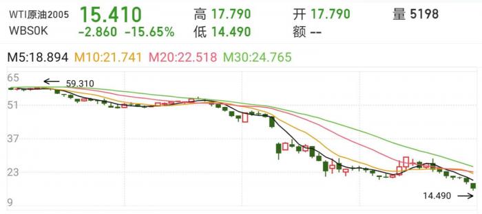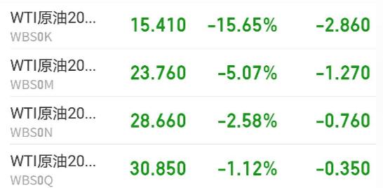 到了4月20日,WTI原油期货5月合约一度跌破15美元/桶,续刷1999年以来的新低值,日内跌幅最大超过18%,6月合约则在23.66美元/桶,跌幅也超过5.4%。