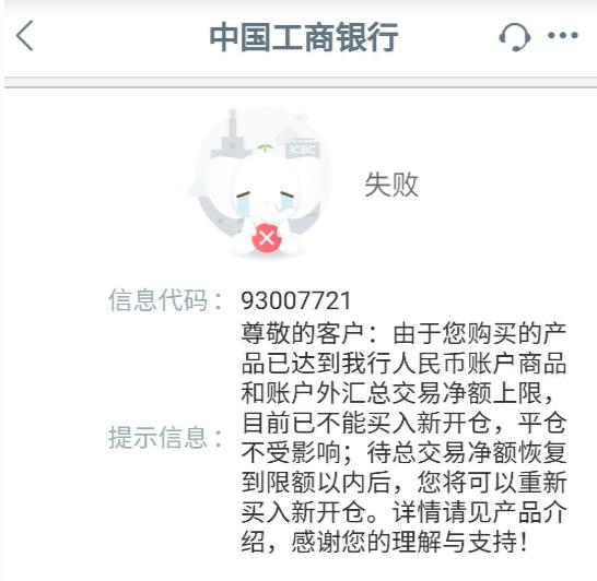 不过,近日有账户原油投资者对21世纪经济报道记者表示,他在3月18日以200元一桶的价格在某银行多单买入150桶人民币账户北美原油产品(连续产品),此后油价走低,但因为被告知人民币账户多类商品(如人民币账户原油、人民币账户天然气、人民币账户大豆、人民币账户铜)和账户外汇的总交易净额已达到交易上限。而根据交易规则,当总交易净额达到上限,客户不能办理先买入后卖出交易的实时买入开仓或提交新的买入开仓挂单,因此导致成本无法降低。