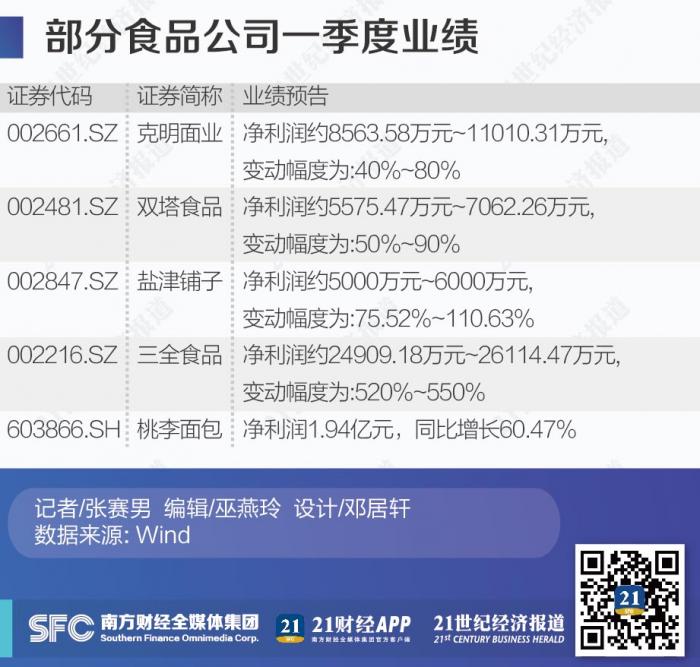 三全食品因此受益,一季度扣非净利润预计为1.5亿元至1.6亿元,同比增长306%-339%。