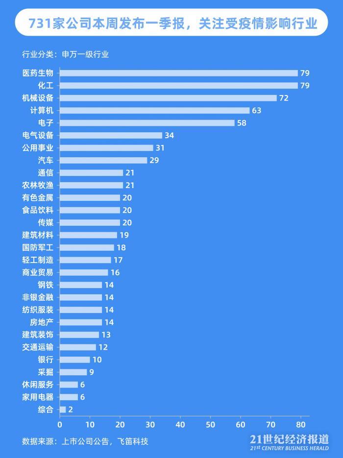 本周(4月20日-4月26日),预计有731家上市公司发布一季度报告,其中医药生物、化工行业预计有79家公司发布一季报,发布数量并列第一。除医药行业外,汽车、食品饮料、传媒、家电等受疫情影响较大的行业本周均有多家上市公司将披露一季度报告,值得重点关注。