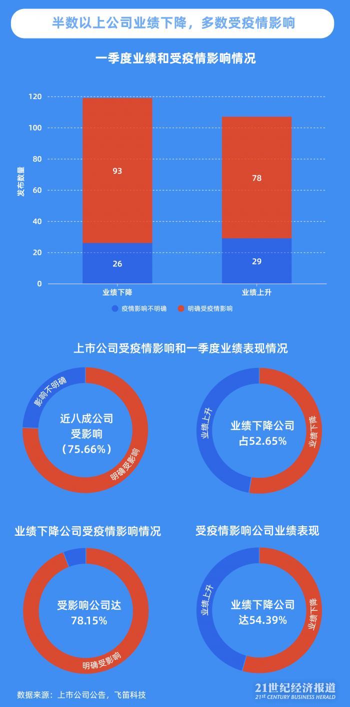 数据显示,截至4月21日,在已发布一季报的226家上市公司中,共有171家在公告中说明一季度生产经营受疫情影响,占比接近八成。南财AI新闻实验室注意到,从全市场公司一季度业绩表现来看,业绩下降的公司超过半数,占比达到了52.65%。