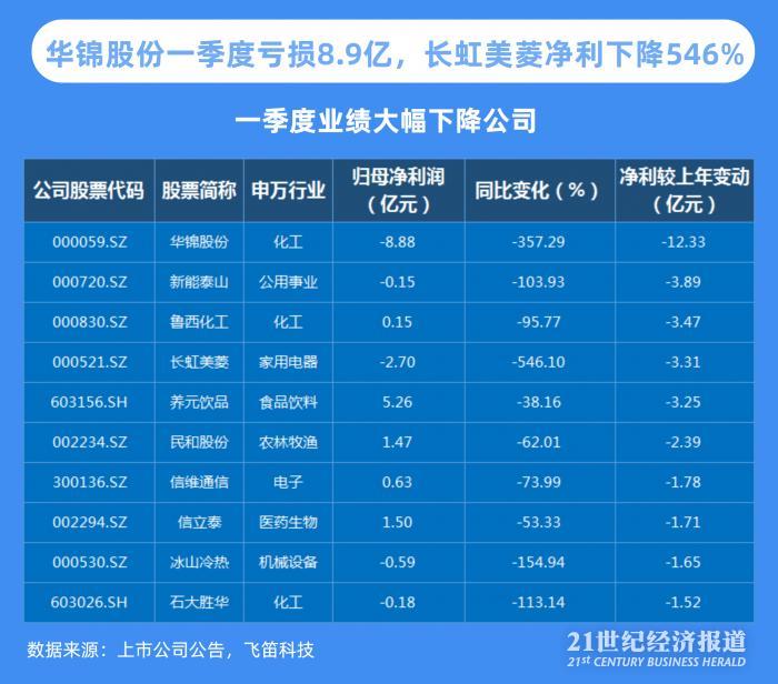 其中,华锦股份2020年一季度实现归母净利润-8.88亿元,较2019年一季度减少12.33亿元,净利润较上年变动额最大;长虹美菱2020年一季度归属母公司净利润同比下降546.10%,归母净利润变动较2019年一季度减少3.89亿元。从所属行业看,一季度业绩大幅下降的公司中,化工、家电、食品饮料等受疫情影响较大的行业均有公司在列。
