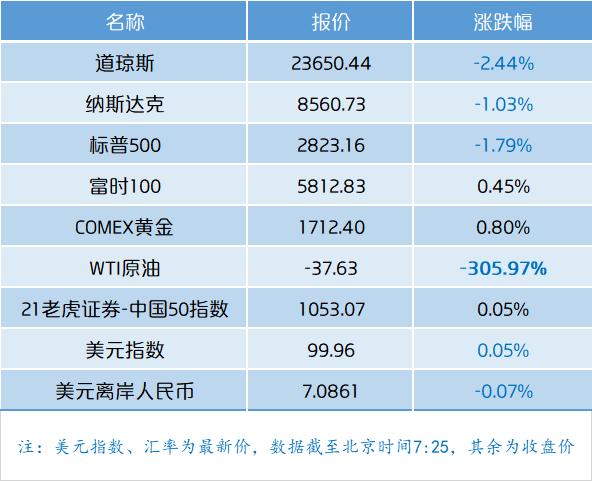 4、道指收跌2.44%,报23650.44点;标普500指数收跌1.79%,报2823.16点;纳指收跌1.03%,报8560.73点。21老虎证券-中国50指数报1053.07点,涨0.05%。成分股中上涨21只,下跌29只,拼多多领涨。