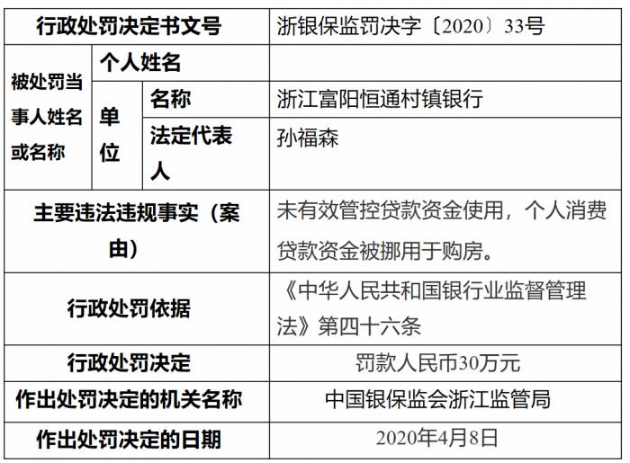 浙江富阳恒通村镇银行因未有效管控贷款资金使用,个人消费贷款资金被挪用于购房,被浙江银保监局罚款30万元。个人消费贷款则是银行向个人发放的用于买车、房屋装修、旅游教育等个人合法合理的消费支出,不得将贷款用于购房和投资等用途。
