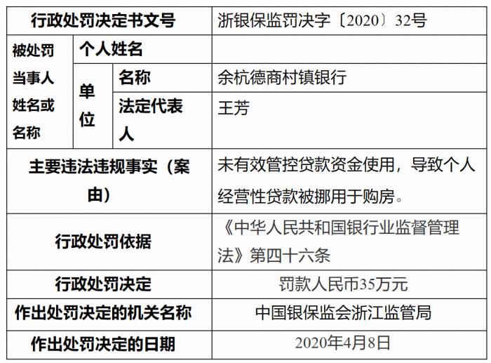 处罚决定书显示,余杭德商村镇银行由于未有效管控贷款资金使用,导致个人经营性贷款被挪用于购房,被浙江银保监局罚款35万元。