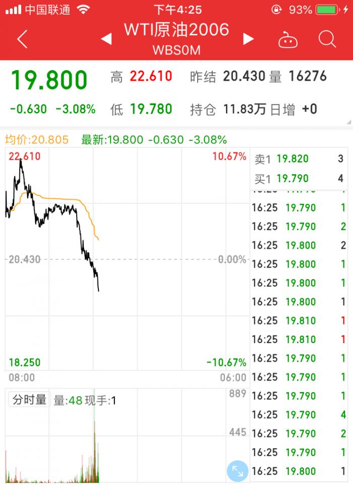 截至北京时间4月21日16:25,WTI原油6月期货合约跌破20美元/桶,日内跌幅逾3%,此前一度涨超10%。