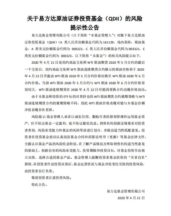 易方达基金表示:2020 年 4 月 21 日是纽约商品交易所 WTI 原油期货 2020 年 5 月合约的最后一个交易日,纽约商品交易所 WTI 原油连续期货合约展示的原油价格将于 2020年 4 月 22 日开盘由 WTI 原油 2020 年5月合约价格切换至 WTI 原油 2020年6月合约价格。当前 WTI 原油 2020 年 5月合约与 WTI 原油 2020 年6月合约价格差别较大,WTI 原油连续期货在 2020 年4月22日可能因更换合约出现价格波动。由于本基金所投资的 ETF 标的对其持仓的 WTI 原油期货合约展期策略与 WTI原油连续期货合约的展期策略不同,因此 WTI 原油价格表现可能与本基金份额净值表现存在差异。