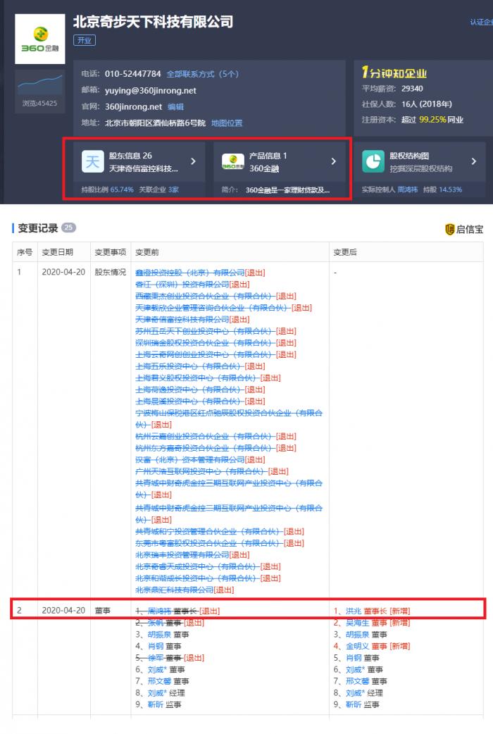 360金融方面对此回应称,北京奇步天下科技有限公司非在美上市公司360金融的主体,齐步天下科技公司的品牌为“360金服”。而在美上市的360金融,其运营主体为上海淇毓信息科技有限公司。周鸿祎仍是360金融上市公司董事长的身份没有变化。