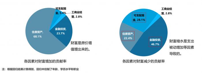 从影响家庭财富变动的住房资产、金融投资、工商业经营、可支配现金四大类因素来看,财富增加的家庭中,住房资产增加贡献了68.1%, 金融投资价值增加贡献了23.7%;财富减少的家庭中,金融投资价值减少因素占46.7%,可支配现金减少因素占28.1%,住房资产减少因素占22.4%。