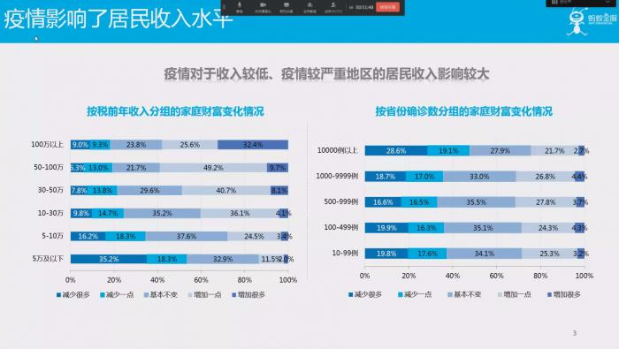 蚂蚁金服集团研究院执行院长李振华亦指出,疫情对家庭收入在5万元以下的群体影响非常大,超过50%的家庭财富在减少;按省份确诊数分组来看,疫情越严重的地方财富受到的影响越大。