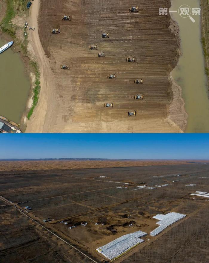 上图为2018年6月拍摄的沅江市南洞庭湖下塞湖矮围集中拆除专项整治行动施工现场。下图为2019年11月工人在位于腾格里沙漠边缘的宁夏中卫市“美利林区”清理污染物。